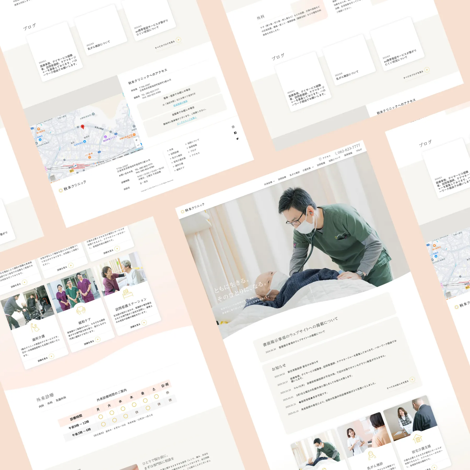 外科・内科・乳腺外科、また、地域のかかりつけ医として「訪問診療・往診(在宅医療)」を行い、「乳検診」「高齢者医療」と「通所介護」「居宅介護」など、安芸地区・海田の医療に取り組んでいる秋本クリニック様のロゴデザインとWebサイトリニューアルを担当させていただきました。