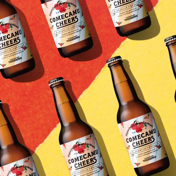 世界最高賞を受賞した八ヶ岳ブルワリー タッチダウンビールの「清里ラガー」と、「ビタミンCの王様」とも呼ばれるカムカムがコラボした、暑い夏に最適なスーパーフルーツビアカクテル「COMECAMU CHEERS(カムカムチアーズ)」のラベルデザインやポスターなどアートワークを担当させていただきました。