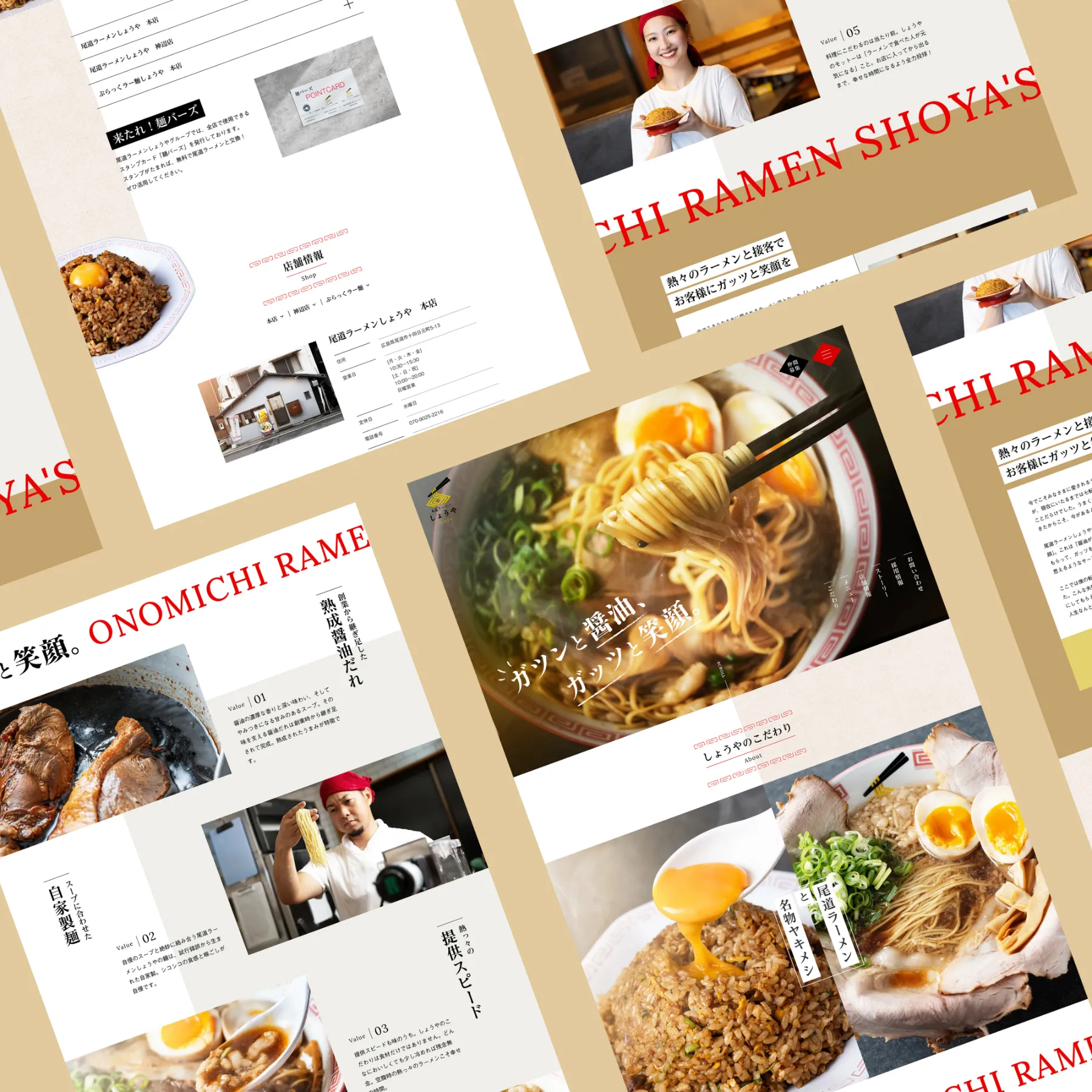 「ガツンと醤油、ガッツと笑顔」をテーマに掲げる「尾道ラーメン しょうや」様の店舗サイトデザイン制作を担当させていただきました。
