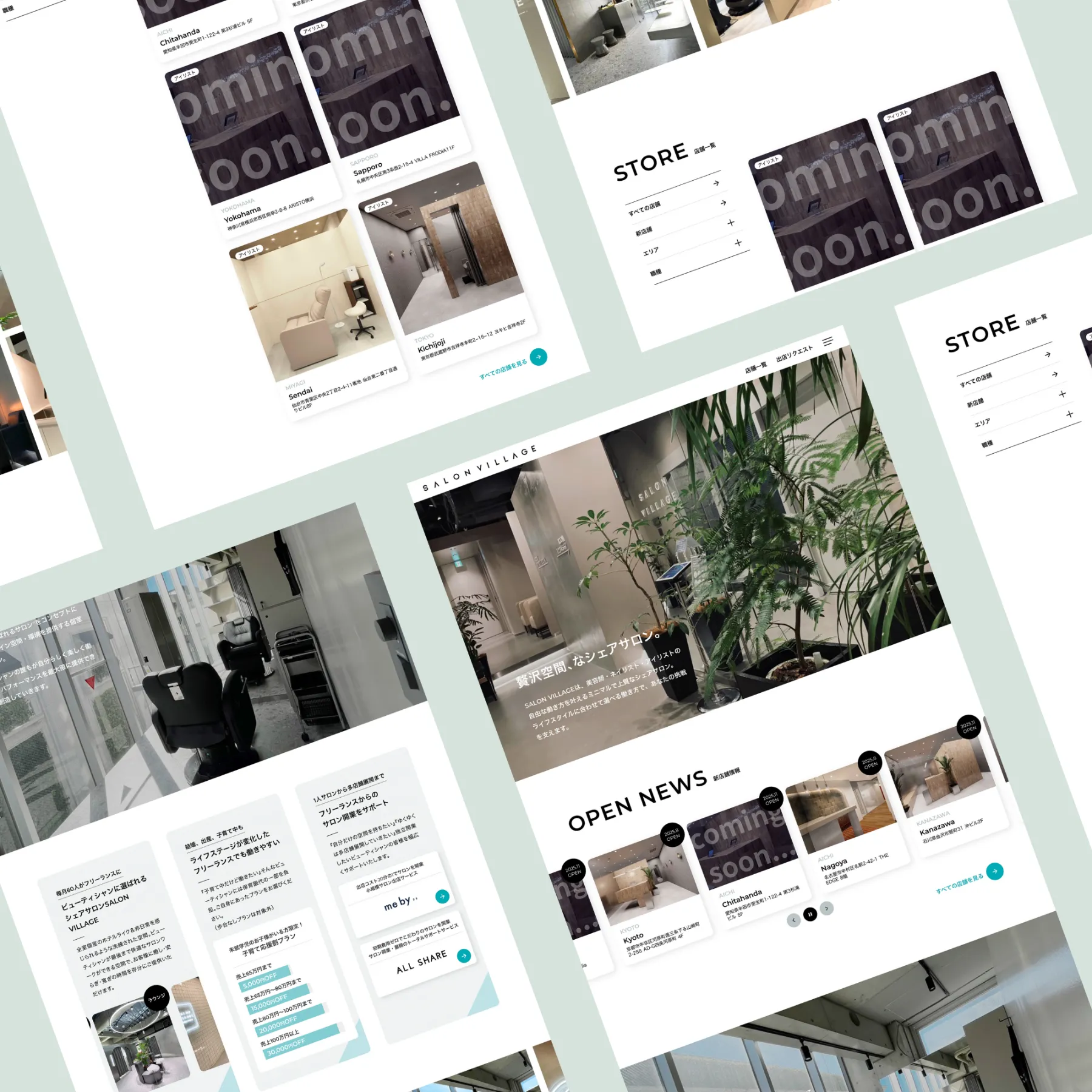 美容師・ネイリスト・アイリストの自由な働き方を叶えるミニマルで上質なシェアサロン「SALON VILLAGE」様のサービスサイトデザイン制作。