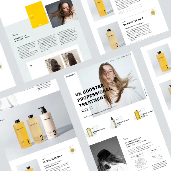 オリジナル原料「KERATEINE®」など髪のダメージ補修力に優れた数種の活性ケラチンを用いたヘアケアブランド「KERAFFECT(ケラフェクト)」の新商品であり、トーンはある程度踏襲しつつ、BtoB向けの内容とブランディング重視の構成にさせていただきました。
